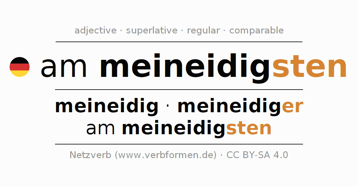 The declension of the adjective am meineidigsten (forsworn, perjured) uses these forms of the comparison meineidig,meineidiger,am meineidigsten. The endings for the comparison in the comparative and superlative are er/sten. The adjective am meineidigsten can be used both attributively in front of a noun as well as predicative in conjunction with a verb.One can not only inflect and compare am meineidigsten, but all German adjectives. Comments ☆