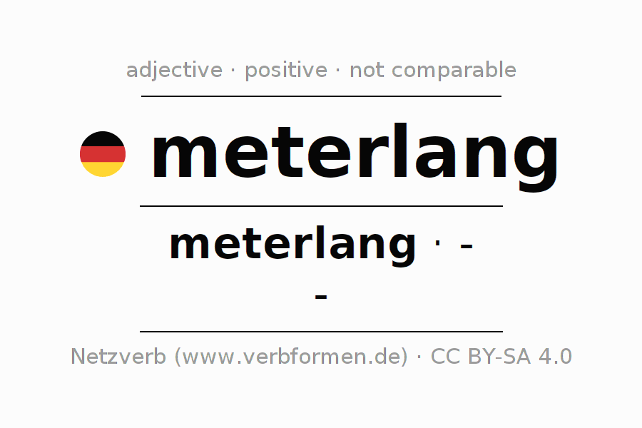 The declension of the adjective meterlang (meter-long, several meters long) uses the incomparable form meterlang. The adjective has no forms for the comparative and superlative. The adjective meterlang can be used both attributively in front of a noun as well as predicative in conjunction with a verb.One can not only inflect and compare meterlang, but all German adjectives. Comments ☆