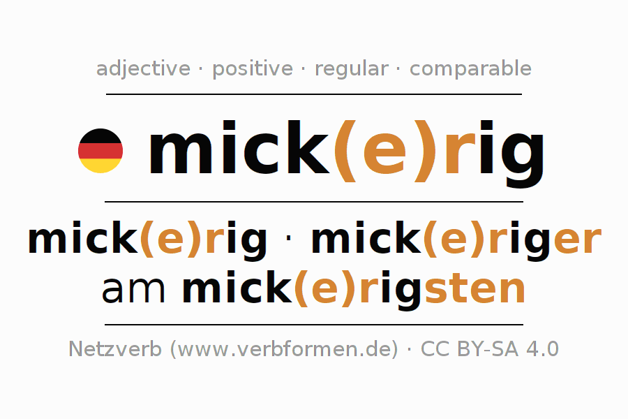 The declension of the adjective mickrig (puny, insignificant) uses these forms of the comparison mickrig,mickriger,am mickrigsten. The endings for the comparison in the comparative and superlative are er/sten. The adjective mickrig can be used both attributively in front of a noun as well as predicative in conjunction with a verb.One can not only inflect and compare mickrig, but all German adjectives. Comments ☆