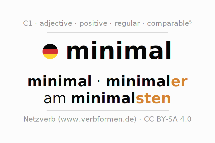 The declension of the adjective minimal (least possible, minimal) uses these forms of the comparison minimal,minimaler,am minimalsten. The endings for the comparison in the comparative and superlative are er/sten. The adjective minimal can be used both attributively in front of a noun as well as predicative in conjunction with a verb.One can not only inflect and compare minimal, but all German adjectives. Comments ☆