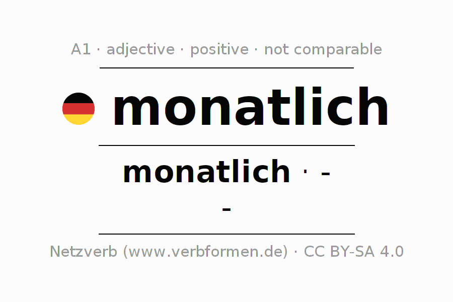 The declension of the adjective monatlich (monthly) uses the incomparable form monatlich. The adjective has no forms for the comparative and superlative. The adjective monatlich can be used both attributively in front of a noun as well as predicative in conjunction with a verb.One can not only inflect and compare monatlich, but all German adjectives. Comments ☆