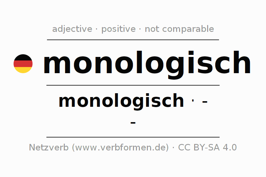 The declension of the adjective monologisch (monologic) uses the incomparable form monologisch. The adjective has no forms for the comparative and superlative. The adjective monologisch can be used both attributively in front of a noun as well as predicative in conjunction with a verb.One can not only inflect and compare monologisch, but all German adjectives. Comments ☆
