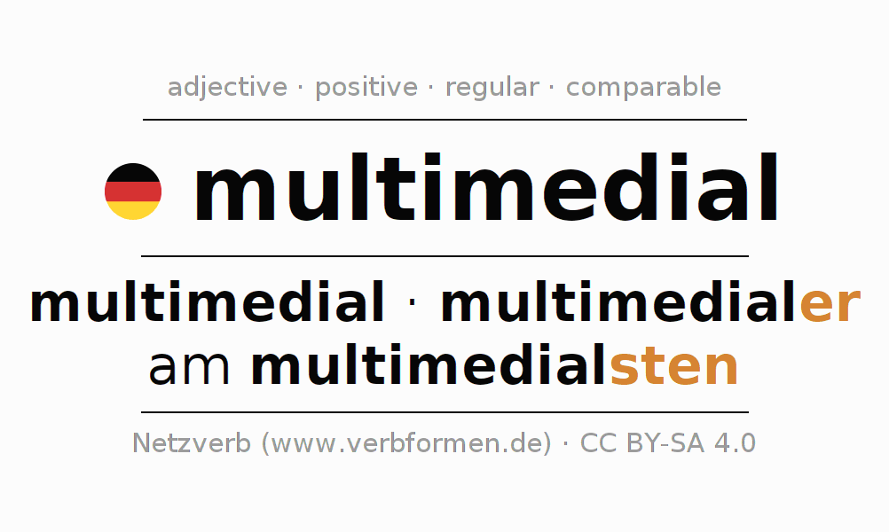 The declension of the adjective multimedial (multimedia, multimedially) uses these forms of the comparison multimedial,multimedialer,am multimedialsten. The endings for the comparison in the comparative and superlative are er/sten. The adjective multimedial can be used both attributively in front of a noun as well as predicative in conjunction with a verb.One can not only inflect and compare multimedial, but all German adjectives. Comments ☆