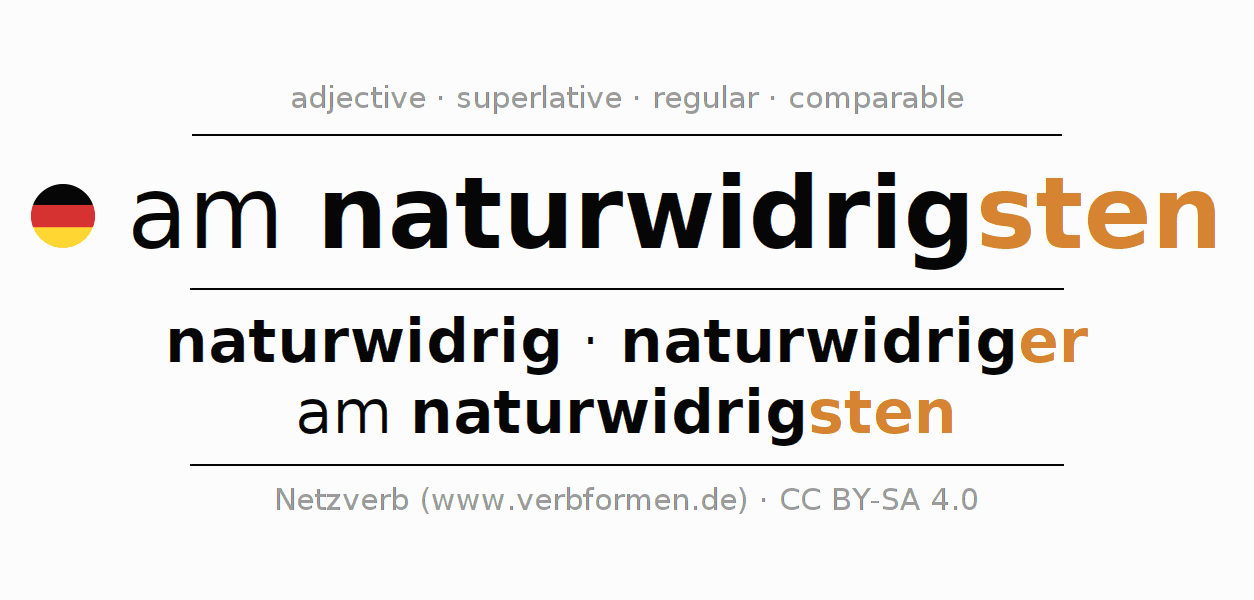 The declension of the adjective am naturwidrigsten (against nature, unnatural) uses these forms of the comparison naturwidrig,naturwidriger,am naturwidrigsten. The endings for the comparison in the comparative and superlative are er/sten. The adjective am naturwidrigsten can be used both attributively in front of a noun as well as predicative in conjunction with a verb.One can not only inflect and compare am naturwidrigsten, but all German adjectives. Comments ☆