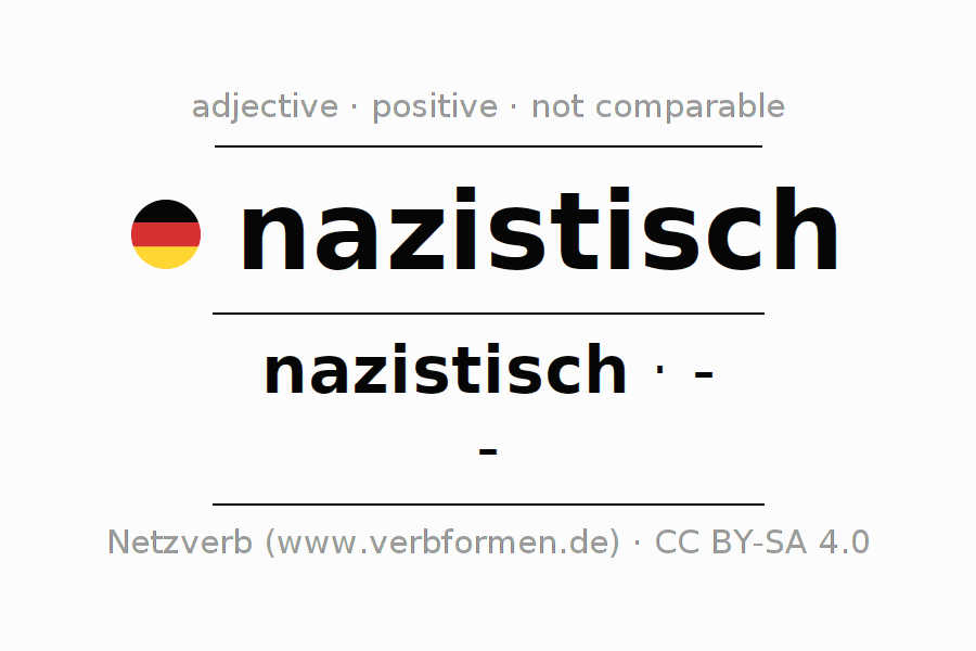The declension of the adjective nazistisch (Nazi) uses the incomparable form nazistisch. The adjective has no forms for the comparative and superlative. The adjective nazistisch can be used both attributively in front of a noun as well as predicative in conjunction with a verb.One can not only inflect and compare nazistisch, but all German adjectives. Comments ☆