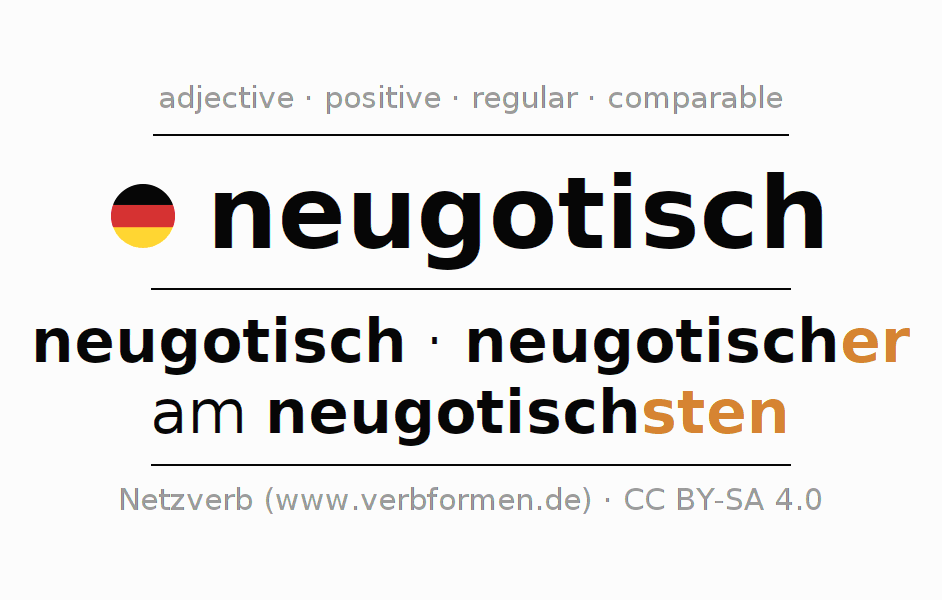 The declension of the adjective neugotisch (Neo-Gothic) uses these forms of the comparison neugotisch,neugotischer,am neugotischsten. The endings for the comparison in the comparative and superlative are er/sten. The adjective neugotisch can be used both attributively in front of a noun as well as predicative in conjunction with a verb.One can not only inflect and compare neugotisch, but all German adjectives. Comments ☆