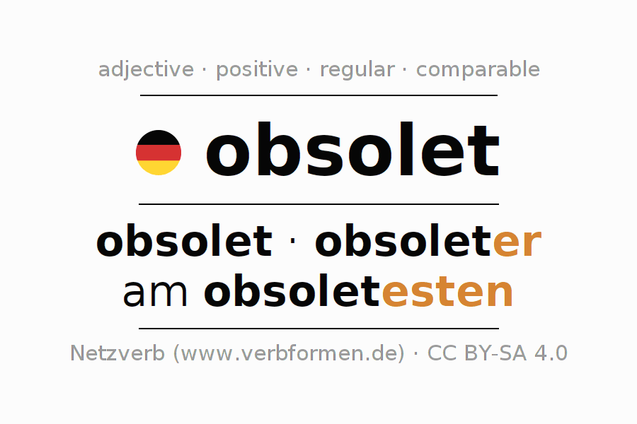 The declension of the adjective obsolet (obsolete, no longer in use) uses these forms of the comparison obsolet,obsoleter,am obsoletesten. The endings for the comparison in the comparative and superlative are er/esten. The adjective obsolet can be used both attributively in front of a noun as well as predicative in conjunction with a verb.One can not only inflect and compare obsolet, but all German adjectives. Comments ☆