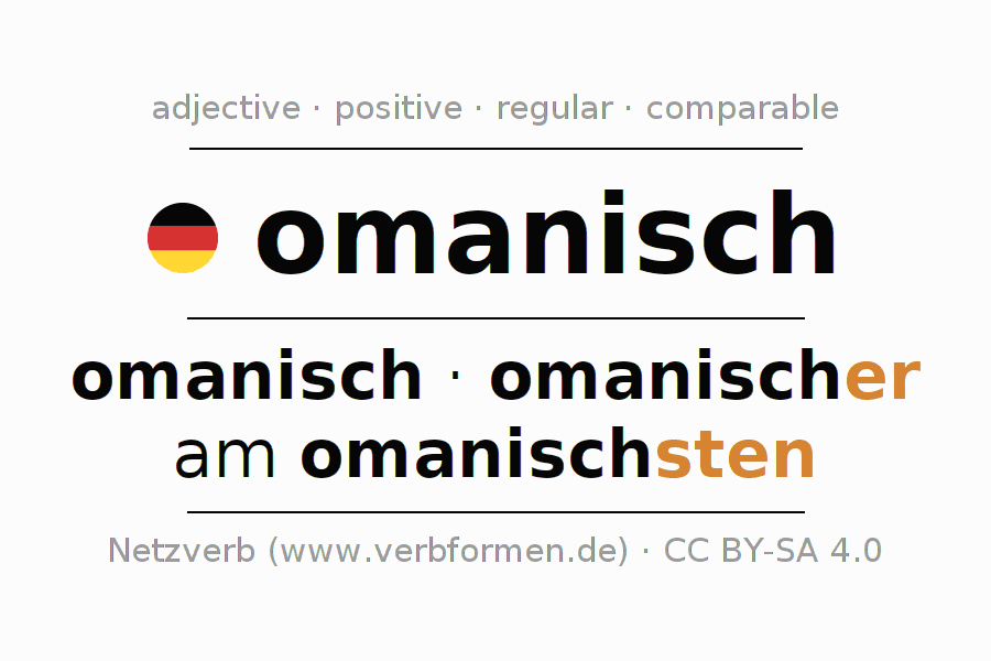 The declension of the adjective omanisch (Omani) uses these forms of the comparison omanisch,omanischer,am omanischsten. The endings for the comparison in the comparative and superlative are er/sten. The adjective omanisch can be used both attributively in front of a noun as well as predicative in conjunction with a verb.One can not only inflect and compare omanisch, but all German adjectives. Comments ☆