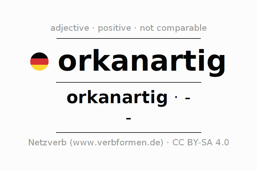 The declension of the adjective orkanartig (stormy, enthusiastic) uses the incomparable form orkanartig. The adjective has no forms for the comparative and superlative. The adjective orkanartig can be used both attributively in front of a noun as well as predicative in conjunction with a verb.One can not only inflect and compare orkanartig, but all German adjectives. Comments ☆