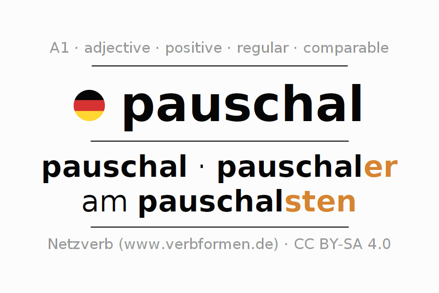 The declension of the adjective pauschal (general, overall) uses these forms of the comparison pauschal,pauschaler,am pauschalsten. The endings for the comparison in the comparative and superlative are er/sten. The adjective pauschal can be used both attributively in front of a noun as well as predicative in conjunction with a verb.One can not only inflect and compare pauschal, but all German adjectives. Comments ☆
