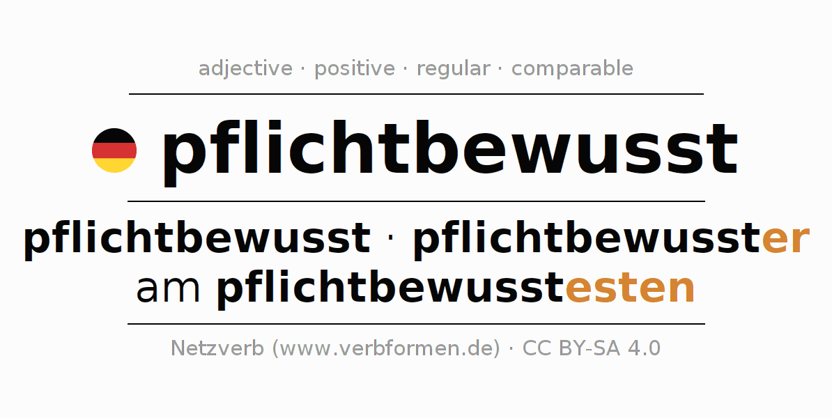 Summary of all declination forms and forms of comparisons of the adjective pflichtbewusst in all genera and cases
