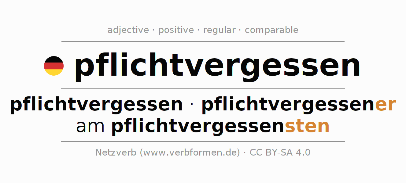 The declension and comparison of pflichtvergessen as declination and comparison tables with all strong, weak and mixed forms. These become clear as tables in the singular and plural and in all four cases nominative, genitive, dative and accusative.