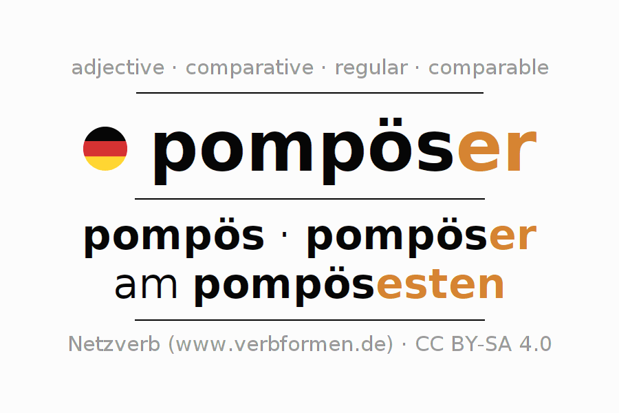 The declension of the adjective pompöser (pompous, grandiose) uses these forms of the comparison pompös,pompöser,am pompösesten. The endings for the comparison in the comparative and superlative are er/esten. The adjective pompöser can be used both attributively in front of a noun as well as predicative in conjunction with a verb.One can not only inflect and compare pompöser, but all German adjectives. Comments ☆