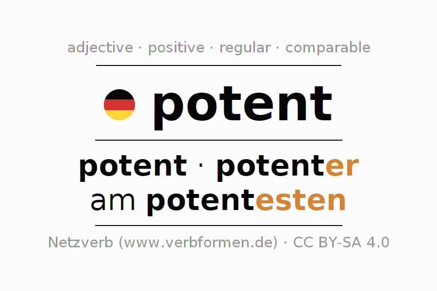 The declension of the adjective potent (powerful, fertile) uses these forms of the comparison potent,potenter,am potentesten. The endings for the comparison in the comparative and superlative are er/esten. The adjective potent can be used both attributively in front of a noun as well as predicative in conjunction with a verb.One can not only inflect and compare potent, but all German adjectives. Comments ☆