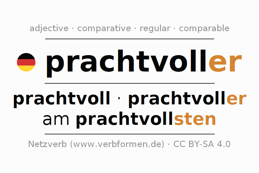 The declension of the adjective prachtvoller (magnificent, splendid) uses these forms of the comparison prachtvoll,prachtvoller,am prachtvollsten. The endings for the comparison in the comparative and superlative are er/sten. The adjective prachtvoller can be used both attributively in front of a noun as well as predicative in conjunction with a verb.One can not only inflect and compare prachtvoller, but all German adjectives. Comments ☆