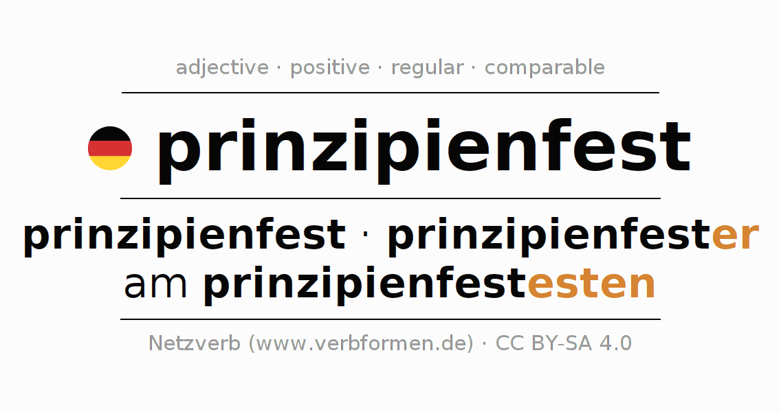 The declension of the adjective prinzipienfest (principled, steadfast) uses these forms of the comparison prinzipienfest,prinzipienfester,am prinzipienfestesten. The endings for the comparison in the comparative and superlative are er/esten. The adjective prinzipienfest can be used both attributively in front of a noun as well as predicative in conjunction with a verb.One can not only inflect and compare prinzipienfest, but all German adjectives. Comments ☆