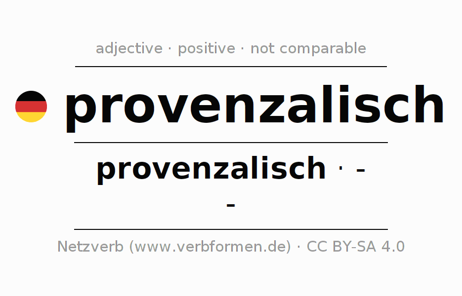 The declension of the adjective provenzalisch uses the incomparable form provenzalisch. The adjective has no forms for the comparative and superlative. The adjective provenzalisch can be used both attributively in front of a noun as well as predicative in conjunction with a verb.One can not only inflect and compare provenzalisch, but all German adjectives. Comments ☆