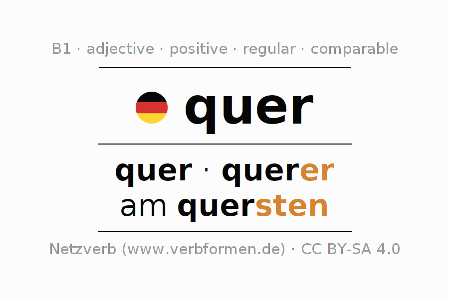 The declension of the adjective quer (askew, crosswise) uses these forms of the comparison quer,querer,am quersten. The endings for the comparison in the comparative and superlative are er/sten. The adjective quer can be used both attributively in front of a noun as well as predicative in conjunction with a verb.One can not only inflect and compare quer, but all German adjectives. Comments ☆