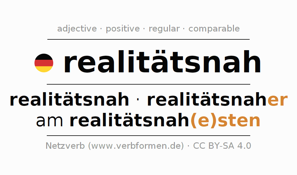 The declension of the adjective realitätsnah (realistic, real-world) uses these forms of the comparison realitätsnah,realitätsnaher,am realitätsnahesten. The endings for the comparison in the comparative and superlative are er/esten. The adjective realitätsnah can be used both attributively in front of a noun as well as predicative in conjunction with a verb.One can not only inflect and compare realitätsnah, but all German adjectives. Comments ☆