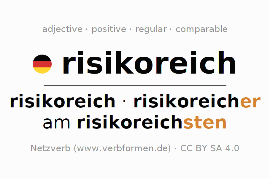 The declension of the adjective risikoreich (hazardous, risky) uses these forms of the comparison risikoreich,risikoreicher,am risikoreichsten. The endings for the comparison in the comparative and superlative are er/sten. The adjective risikoreich can be used both attributively in front of a noun as well as predicative in conjunction with a verb.One can not only inflect and compare risikoreich, but all German adjectives. Comments ☆