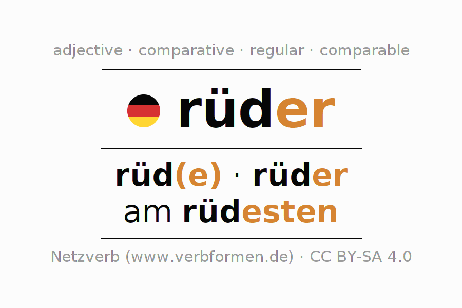 The declension of the adjective rüder (rude, rough) uses these forms of the comparison rüde,rüder,am rüdesten. The endings for the comparison in the comparative and superlative are er/esten. The adjective rüder can be used both attributively in front of a noun as well as predicative in conjunction with a verb.One can not only inflect and compare rüder, but all German adjectives. Comments ☆