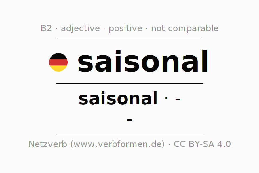 The declension of the adjective saisonal (seasonal) uses the incomparable form saisonal. The adjective has no forms for the comparative and superlative. The adjective saisonal can be used both attributively in front of a noun as well as predicative in conjunction with a verb.One can not only inflect and compare saisonal, but all German adjectives. Comments ☆
