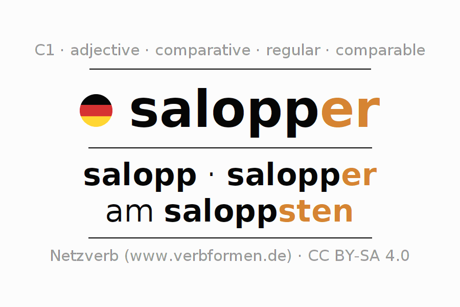 The declension of the adjective salopper (casual, informal) uses these forms of the comparison salopp,salopper,am saloppsten. The endings for the comparison in the comparative and superlative are er/sten. The adjective salopper can be used both attributively in front of a noun as well as predicative in conjunction with a verb.One can not only inflect and compare salopper, but all German adjectives. Comments ☆
