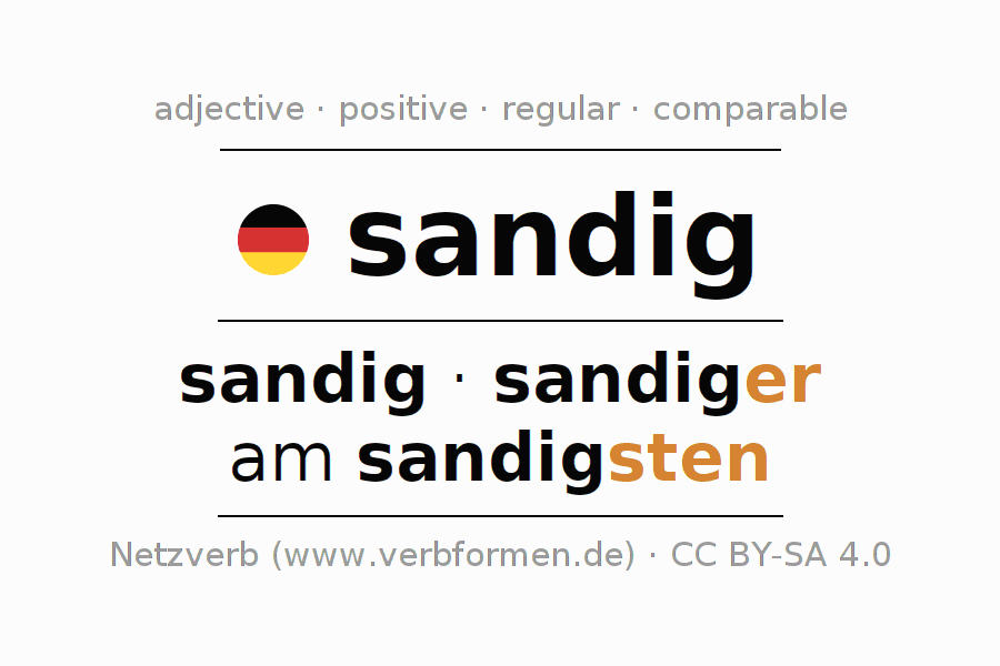 The declension of the adjective sandig (sandy) uses these forms of the comparison sandig,sandiger,am sandigsten. The endings for the comparison in the comparative and superlative are er/sten. The adjective sandig can be used both attributively in front of a noun as well as predicative in conjunction with a verb.One can not only inflect and compare sandig, but all German adjectives. Comments ☆