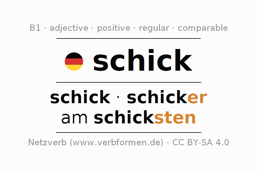 The declension of the adjective schick (stylish, elegant) uses these forms of the comparison schick,schicker,am schicksten. The endings for the comparison in the comparative and superlative are er/sten. The adjective schick can be used both attributively in front of a noun as well as predicative in conjunction with a verb.One can not only inflect and compare schick, but all German adjectives. Comments ☆