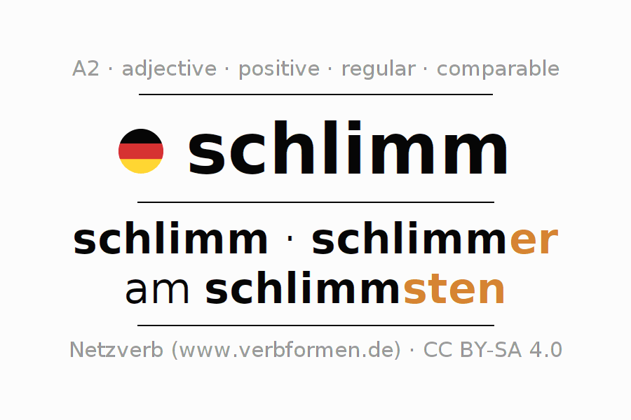 The declension of the adjective schlimm (bad, terrible) uses these forms of the comparison schlimm,schlimmer,am schlimmsten. The endings for the comparison in the comparative and superlative are er/sten. The adjective schlimm can be used both attributively in front of a noun as well as predicative in conjunction with a verb.One can not only inflect and compare schlimm, but all German adjectives. Comments ☆