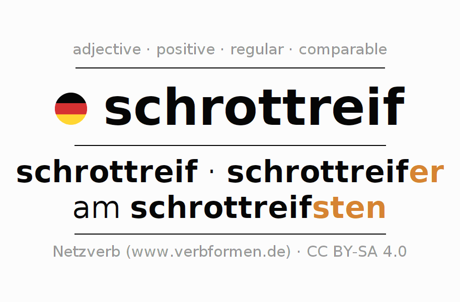 The declension and comparison of schrottreif as declination and comparison tables with all strong, weak and mixed forms. These become clear as tables in the singular and plural and in all four cases nominative, genitive, dative and accusative.