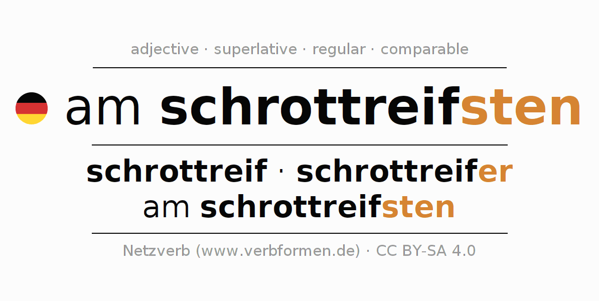 The declension of the adjective am schrottreifsten (beyond repair, junk) uses these forms of the comparison schrottreif,schrottreifer,am schrottreifsten. The endings for the comparison in the comparative and superlative are er/sten. The adjective am schrottreifsten can be used both attributively in front of a noun as well as predicative in conjunction with a verb.One can not only inflect and compare am schrottreifsten, but all German adjectives. Comments ☆
