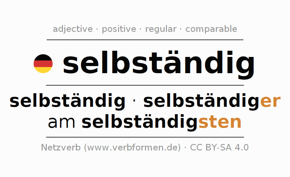 The declension of the adjective selbständig (independent, entrepreneurial) uses these forms of the comparison selbständig,selbständiger,am selbständigsten. The endings for the comparison in the comparative and superlative are er/sten. The adjective selbständig can be used both attributively in front of a noun as well as predicative in conjunction with a verb.One can not only inflect and compare selbständig, but all German adjectives. Comments ☆