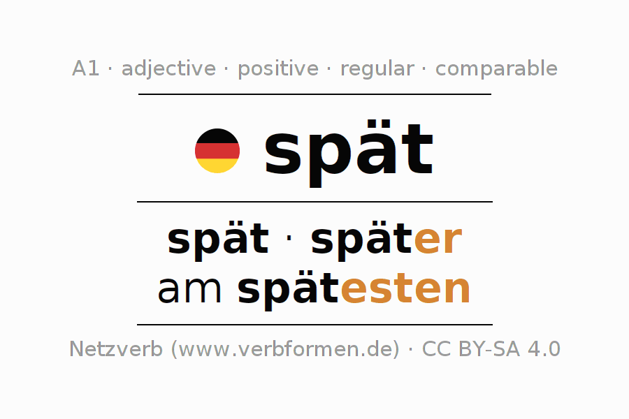 The declension of the adjective spät (late, fresh) uses these forms of the comparison spät,später,am spätesten. The endings for the comparison in the comparative and superlative are er/esten. The adjective spät can be used both attributively in front of a noun as well as predicative in conjunction with a verb.One can not only inflect and compare spät, but all German adjectives. Comments ☆