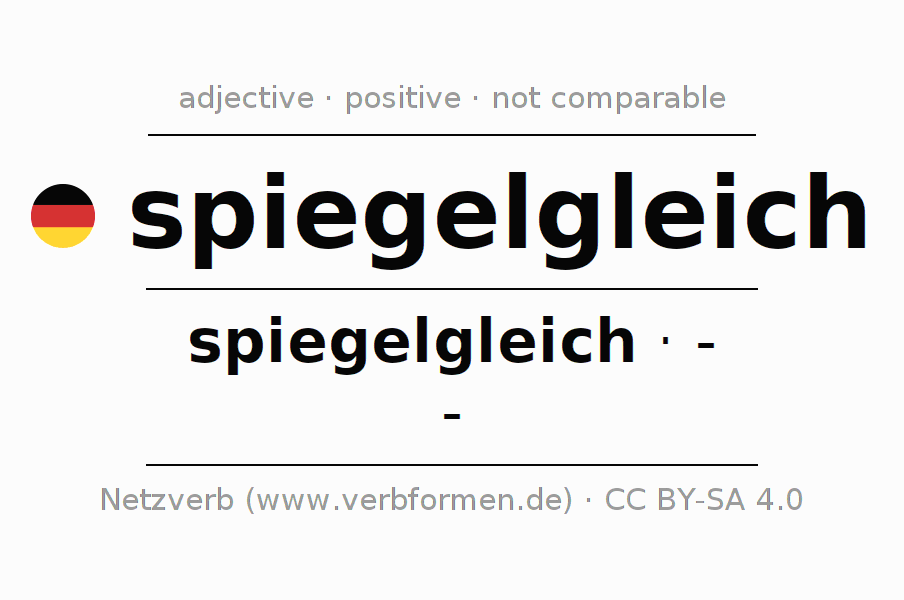 The declension of the adjective spiegelgleich (mirror-like, symmetrical) uses the incomparable form spiegelgleich. The adjective has no forms for the comparative and superlative. The adjective spiegelgleich can be used both attributively in front of a noun as well as predicative in conjunction with a verb.One can not only inflect and compare spiegelgleich, but all German adjectives. Comments ☆
