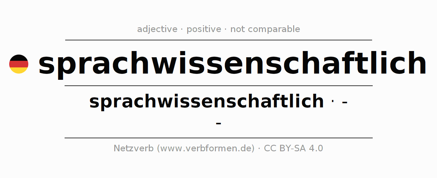 The declension of the adjective sprachwissenschaftlich (linguistic, language-related) uses the incomparable form sprachwissenschaftlich. The adjective has no forms for the comparative and superlative. The adjective sprachwissenschaftlich can be used both attributively in front of a noun as well as predicative in conjunction with a verb.One can not only inflect and compare sprachwissenschaftlich, but all German adjectives. Comments ☆