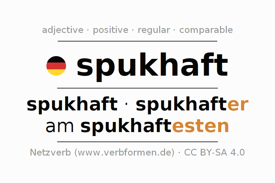 The declension of the adjective spukhaft (eerie, ghostly) uses these forms of the comparison spukhaft,spukhafter,am spukhaftesten. The endings for the comparison in the comparative and superlative are er/esten. The adjective spukhaft can be used both attributively in front of a noun as well as predicative in conjunction with a verb.One can not only inflect and compare spukhaft, but all German adjectives. Comments ☆
