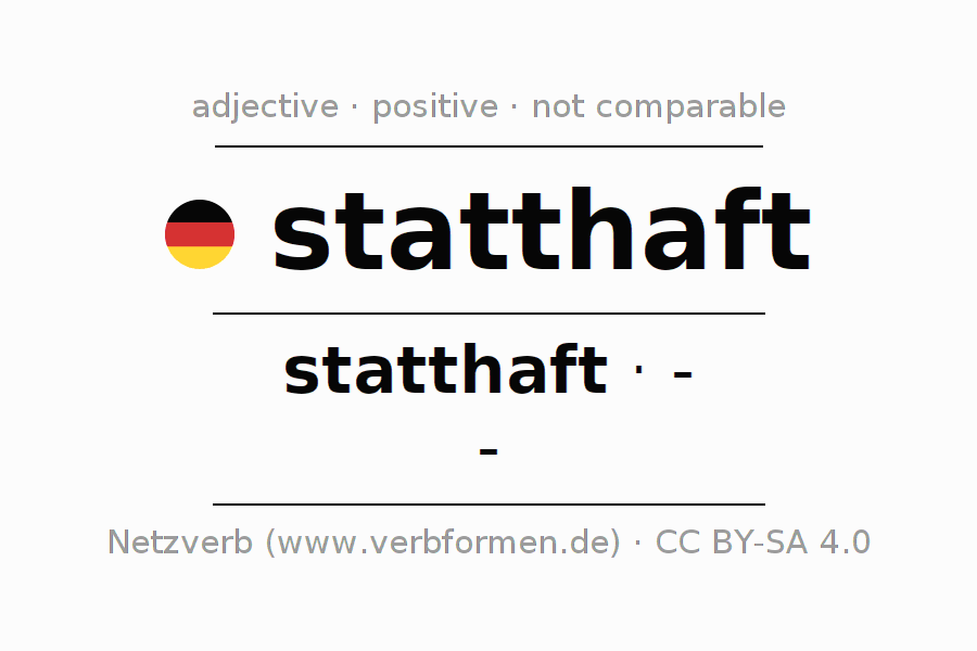 The declension of the adjective statthaft (allowed, permissible) uses the incomparable form statthaft. The adjective has no forms for the comparative and superlative. The adjective statthaft can be used both attributively in front of a noun as well as predicative in conjunction with a verb.One can not only inflect and compare statthaft, but all German adjectives. Comments ☆
