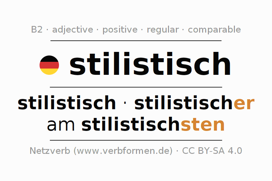 The declension of the adjective stilistisch (stylistic) uses these forms of the comparison stilistisch,stilistischer,am stilistischsten. The endings for the comparison in the comparative and superlative are er/sten. The adjective stilistisch can be used both attributively in front of a noun as well as predicative in conjunction with a verb.One can not only inflect and compare stilistisch, but all German adjectives. Comments ☆