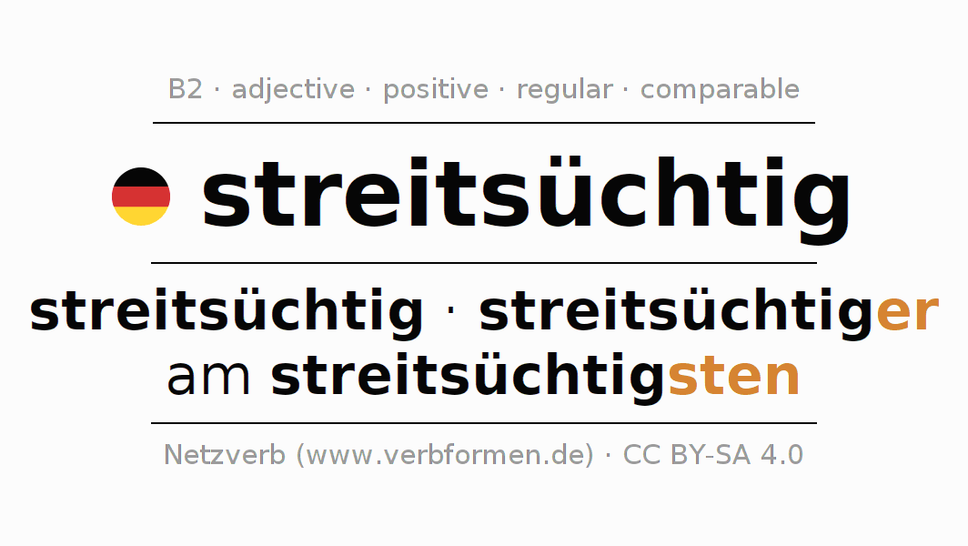 The declension of the adjective streitsüchtig (quarrelsome, contentious) uses these forms of the comparison streitsüchtig,streitsüchtiger,am streitsüchtigsten. The endings for the comparison in the comparative and superlative are er/sten. The adjective streitsüchtig can be used both attributively in front of a noun as well as predicative in conjunction with a verb.One can not only inflect and compare streitsüchtig, but all German adjectives. Comments ☆