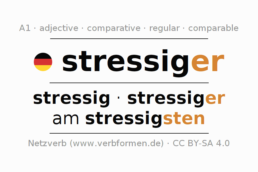 The declension of the adjective stressiger (stressful, straining) uses these forms of the comparison stressig,stressiger,am stressigsten. The endings for the comparison in the comparative and superlative are er/sten. The adjective stressiger can be used both attributively in front of a noun as well as predicative in conjunction with a verb.One can not only inflect and compare stressiger, but all German adjectives. Comments ☆