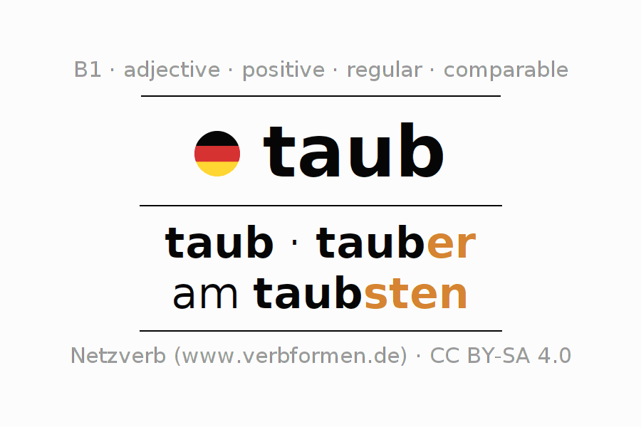 The declension of the adjective taub (deaf, insensitive) uses these forms of the comparison taub,tauber,am taubsten. The endings for the comparison in the comparative and superlative are er/sten. The adjective taub can be used both attributively in front of a noun as well as predicative in conjunction with a verb.One can not only inflect and compare taub, but all German adjectives. Comments ☆