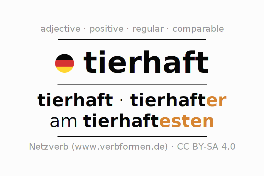 The declension of the adjective tierhaft (animal-like, animalistic) uses these forms of the comparison tierhaft,tierhafter,am tierhaftesten. The endings for the comparison in the comparative and superlative are er/esten. The adjective tierhaft can be used both attributively in front of a noun as well as predicative in conjunction with a verb.One can not only inflect and compare tierhaft, but all German adjectives. Comments ☆