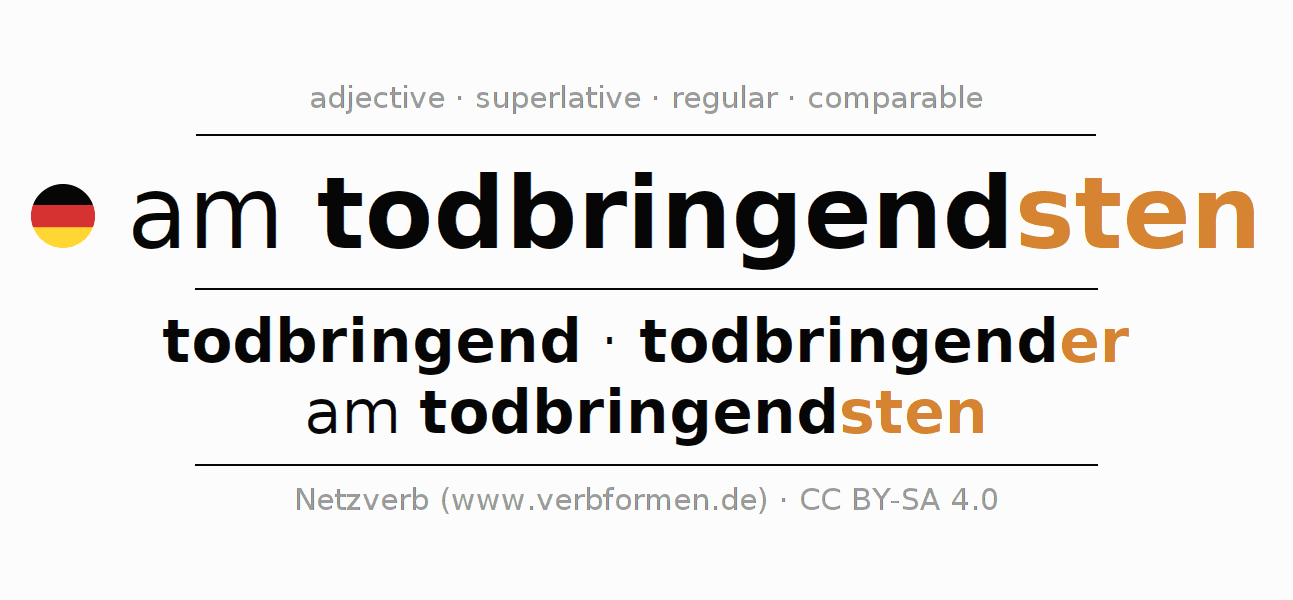 The declension of the adjective am todbringendsten (deadly, life-threatening) uses these forms of the comparison todbringend,todbringender,am todbringendsten. The endings for the comparison in the comparative and superlative are er/sten. The adjective am todbringendsten can be used both attributively in front of a noun as well as predicative in conjunction with a verb.One can not only inflect and compare am todbringendsten, but all German adjectives. Comments ☆