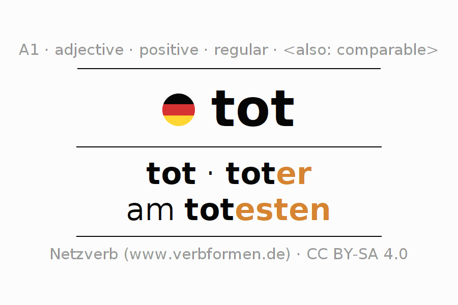 The declension of the adjective tot (dead) uses these forms of the comparison tot,toter,am totesten. The endings for the comparison in the comparative and superlative are er/esten. The adjective tot can be used both attributively in front of a noun as well as predicative in conjunction with a verb.One can not only inflect and compare tot, but all German adjectives. Comments ☆
