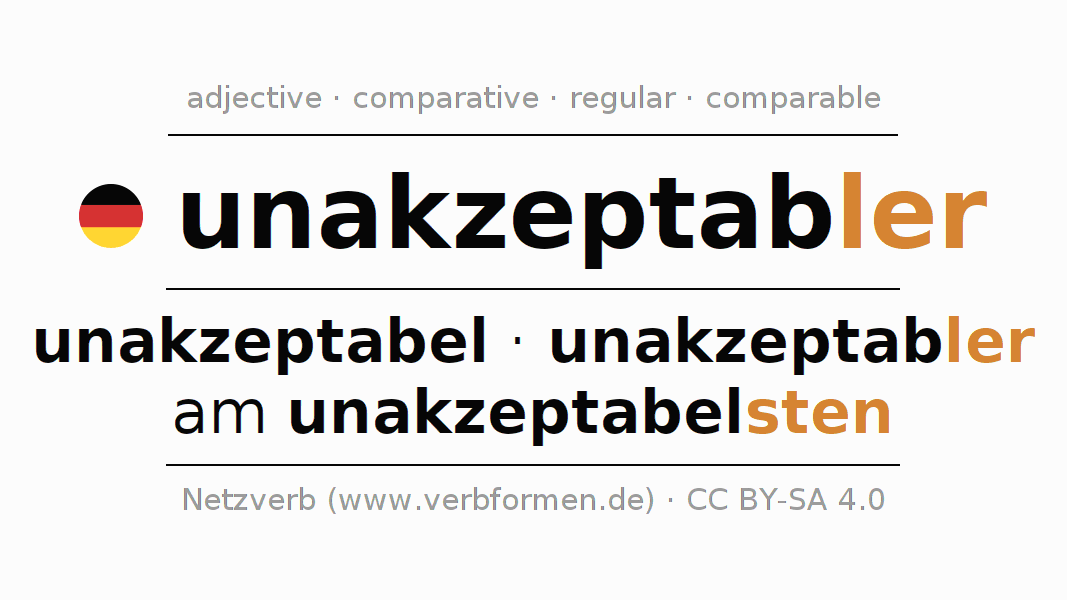The declension of the adjective unakzeptabler (unacceptable) uses these forms of the comparison unakzeptabel,unakzeptabler,am unakzeptabelsten. The endings for the comparison in the comparative and superlative are er/sten. The adjective unakzeptabler can be used both attributively in front of a noun as well as predicative in conjunction with a verb.One can not only inflect and compare unakzeptabler, but all German adjectives. Comments ☆