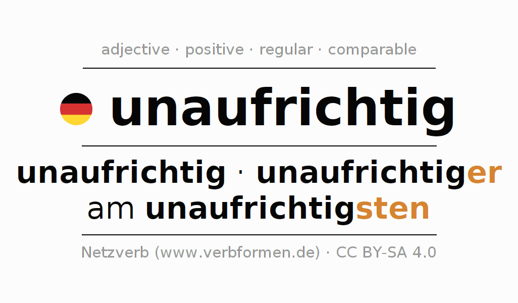 The declension of the adjective unaufrichtig (insincere, dishonest) uses these forms of the comparison unaufrichtig,unaufrichtiger,am unaufrichtigsten. The endings for the comparison in the comparative and superlative are er/sten. The adjective unaufrichtig can be used both attributively in front of a noun as well as predicative in conjunction with a verb.One can not only inflect and compare unaufrichtig, but all German adjectives. Comments ☆
