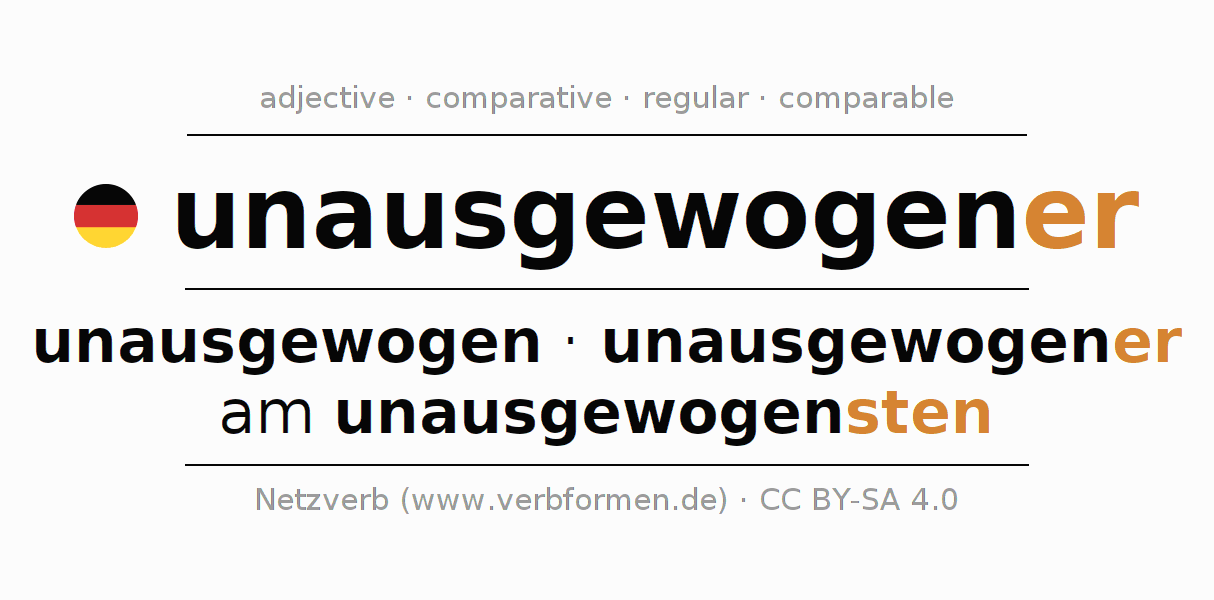 The declension of the adjective unausgewogener (imbalanced, unbalanced) uses these forms of the comparison unausgewogen,unausgewogener,am unausgewogensten. The endings for the comparison in the comparative and superlative are er/sten. The adjective unausgewogener can be used both attributively in front of a noun as well as predicative in conjunction with a verb.One can not only inflect and compare unausgewogener, but all German adjectives. Comments ☆