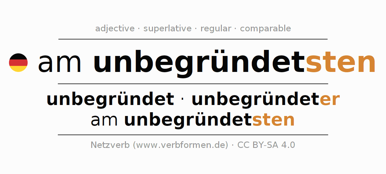 The declension of the adjective am unbegründetsten (unfounded, baseless) uses these forms of the comparison unbegründet,unbegründeter,am unbegründetsten. The endings for the comparison in the comparative and superlative are er/sten. The adjective am unbegründetsten can be used both attributively in front of a noun as well as predicative in conjunction with a verb.One can not only inflect and compare am unbegründetsten, but all German adjectives. Comments ☆