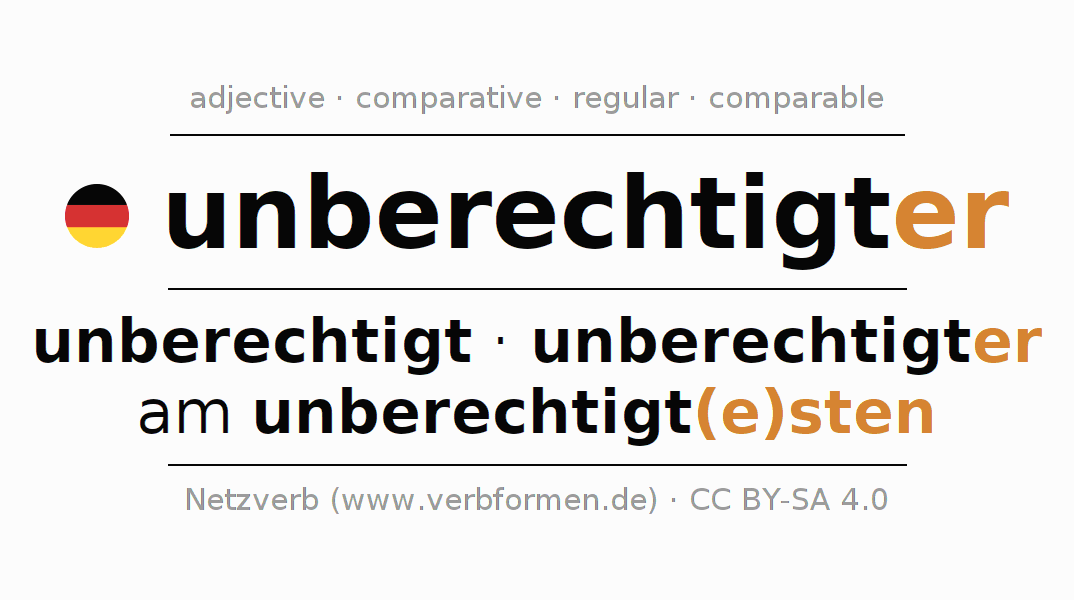 The declension of the adjective unberechtigter (illegitimate, unjustified) uses these forms of the comparison unberechtigt,unberechtigter,am unberechtigtsten. The endings for the comparison in the comparative and superlative are er/sten. The adjective unberechtigter can be used both attributively in front of a noun as well as predicative in conjunction with a verb.One can not only inflect and compare unberechtigter, but all German adjectives. Comments ☆